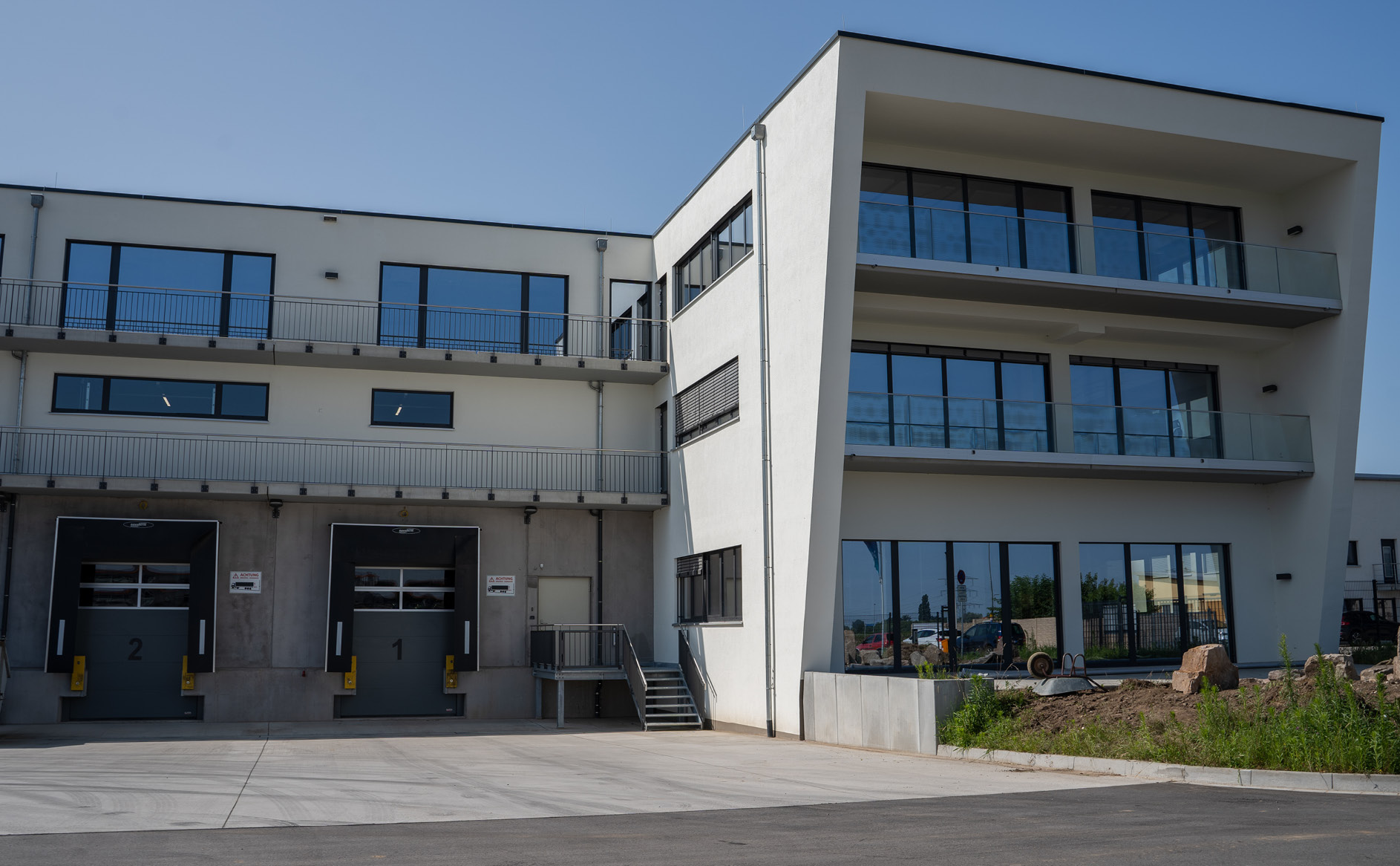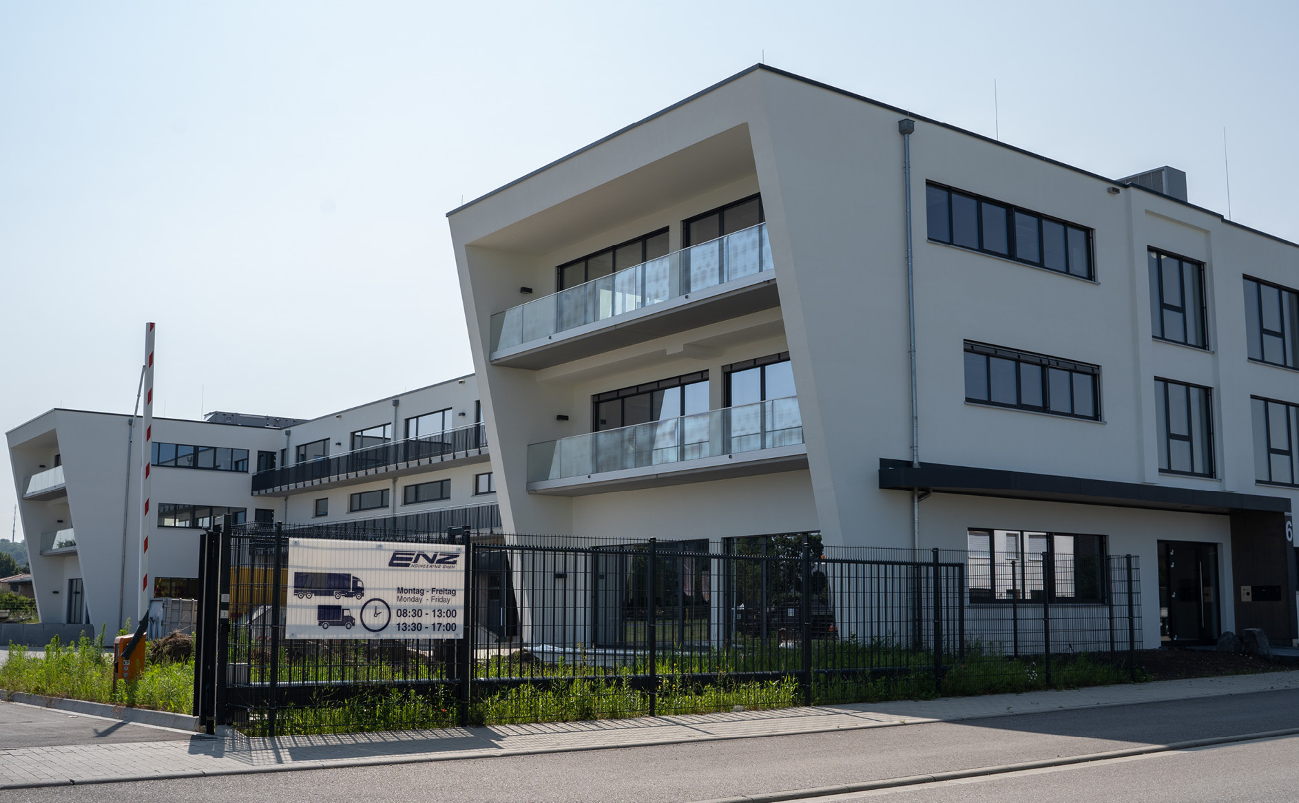 Der Gebäudekomplex umfasst zwei Hallen für Lager und Logistik sowie einem sich jeweils anschließenden Bürotrakt. Die beiden Bürogebäude mit jeweils drei Geschossen sind an die beiden Lagerhallen diagonal angegliedert. Der Gebäudekomplex ist der schlüsselfertig übergebene, neue Firmensitz der E.N.Z. Engineering GmbH.