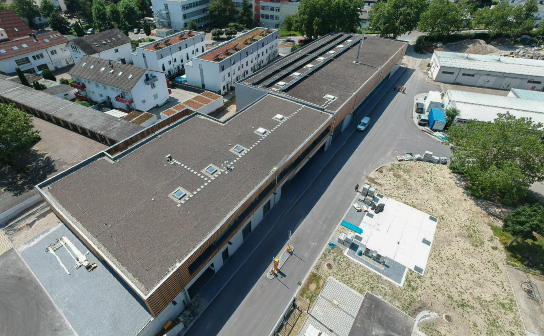 Das Sozialgebäude bietet auf 46 Metern Länge und 25 Metern Breite ausreichend Raum für die Aufenthalts- und Sanitärräume von bis zu 150 Mitarbeitenden. Den Beschäftigten steht ein lichtdurchfluteter Pausenraum mit einer großzügigen Küchenzeile zur Verfügung und ein Umkleidebereich mit Duschen und 400 Spinden. Ebenso verfügt dieses Gebäude über ein – barrierefrei per Aufzug – zu erreichendes weiteres Geschoss mit 14 Verwaltungsräumen und einem Schulungszimmer mit Zugang zur offenen Dachterrasse.